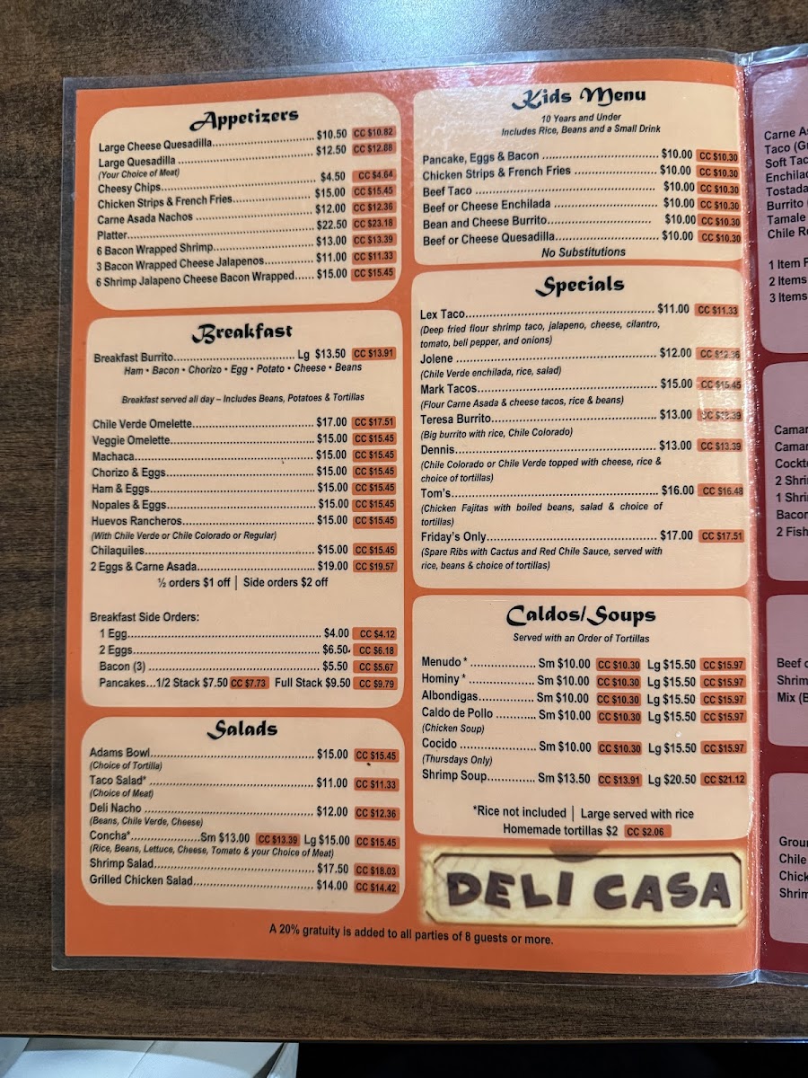 Deli Casa offers a straightforward and inviting menu rooted in authentic Mexican flavors. The selection ranges from hearty breakfast plates like Huevos Rancheros with Chile Verde to satisfying midday combinations such as Chicken Mole or Carne Asada, making it a versatile spot for both morning and afternoon meals.